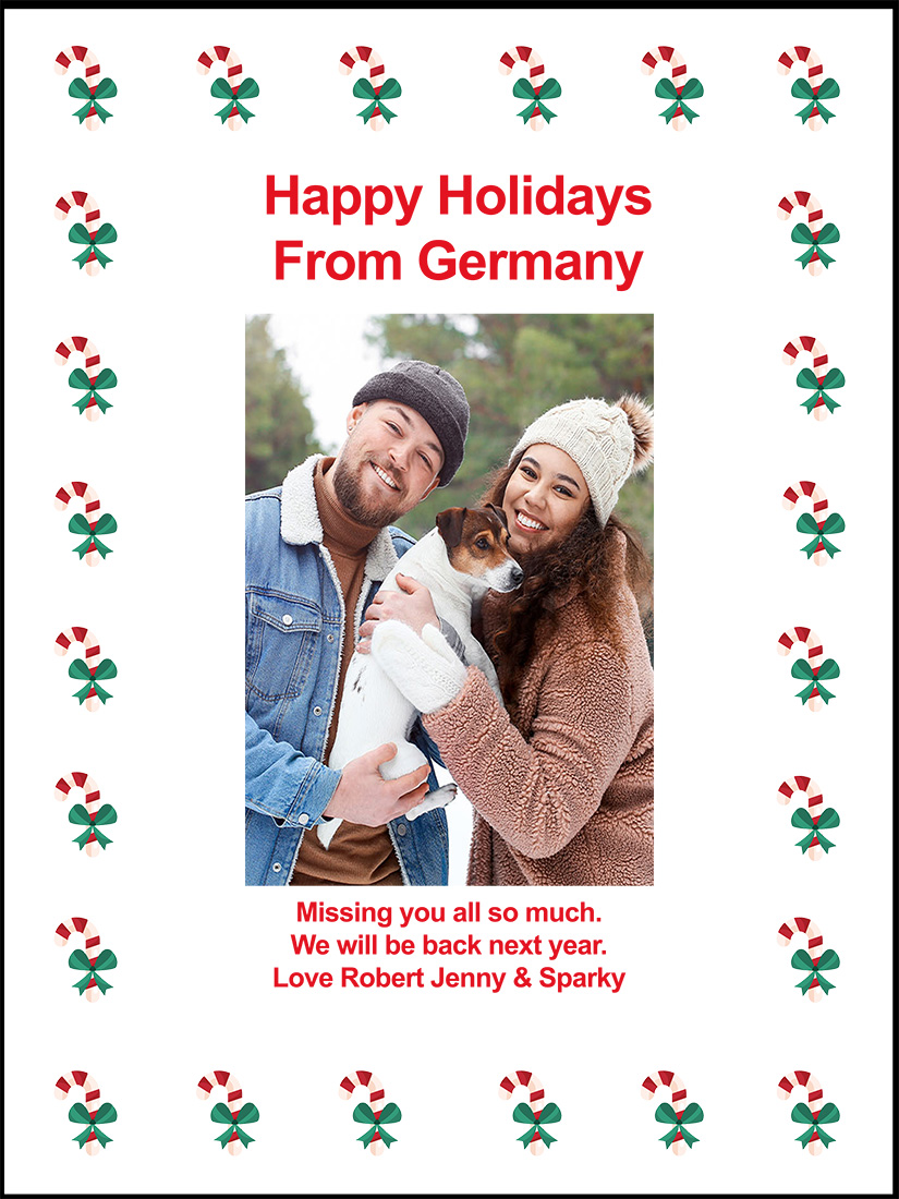 Candy Calendar with a photo quality 5×7 image in the center and 6 gourmet chocolate treats on each side (24 total chocolates). Add your personal heading above the image and a message below the image. Both can be up to 150 characters long. Select the graphic you with to have printed over each of the chococates. The chocolates can also be numbered 1-24 if you choose.